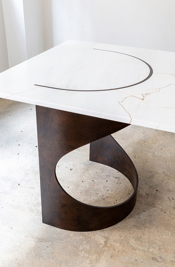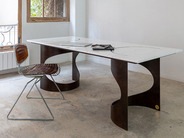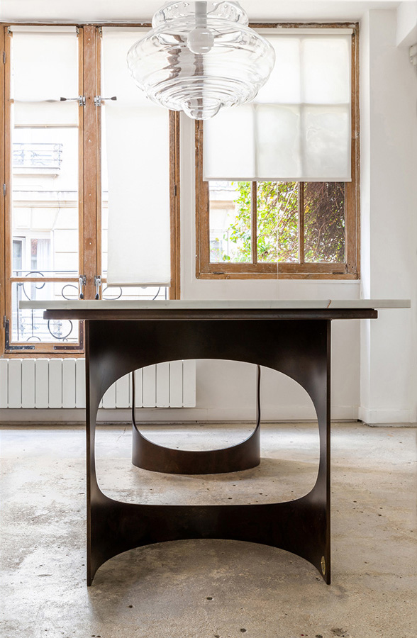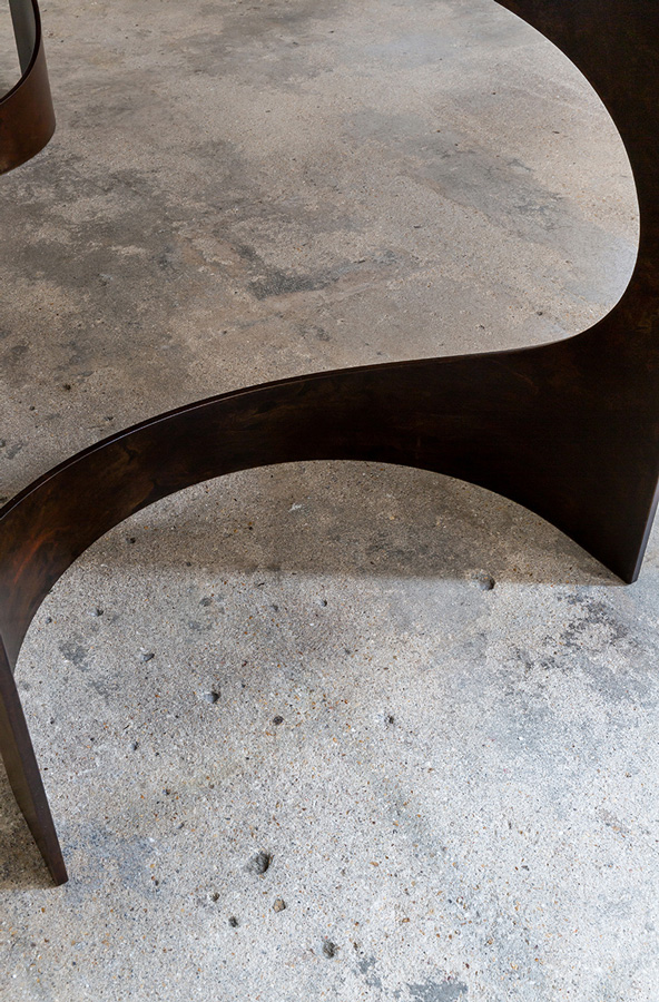 Piètement : feuille d’acier découpée, cintrée et patinée.