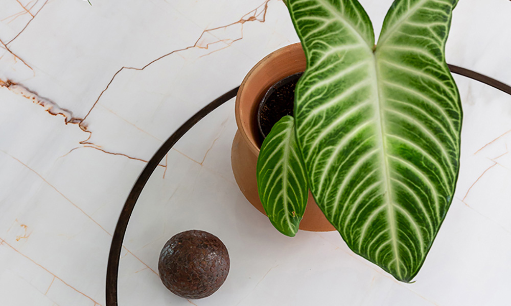 La table BACO se singularise par un piètement traversant le plateau, s’y encastrant avec précision et se révélant en affleurement à la surface de la pierre.