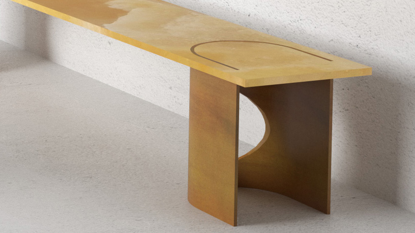 Onyx et feuille d’acier découpée, cintrée et patinée.